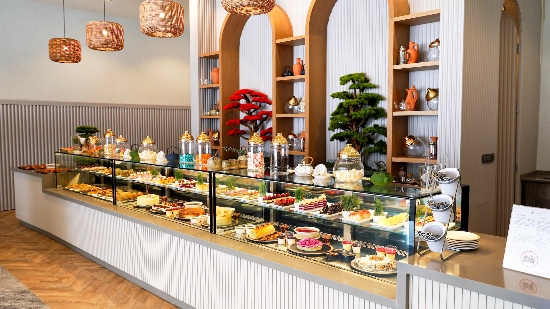 Für Gäste, die einen süßen Ausflug machen möchten, wird den ganzen Tag frisch zubereitetes Gebäck, Kekse, Kuchen und Pralinen angeboten. Hausgemachtes Eis und Süßigkeiten, die mit türkischem Kaffee serviert werden, ermöglichen es den Gästen, während ihrer Pause leckere Momente zu genießen.